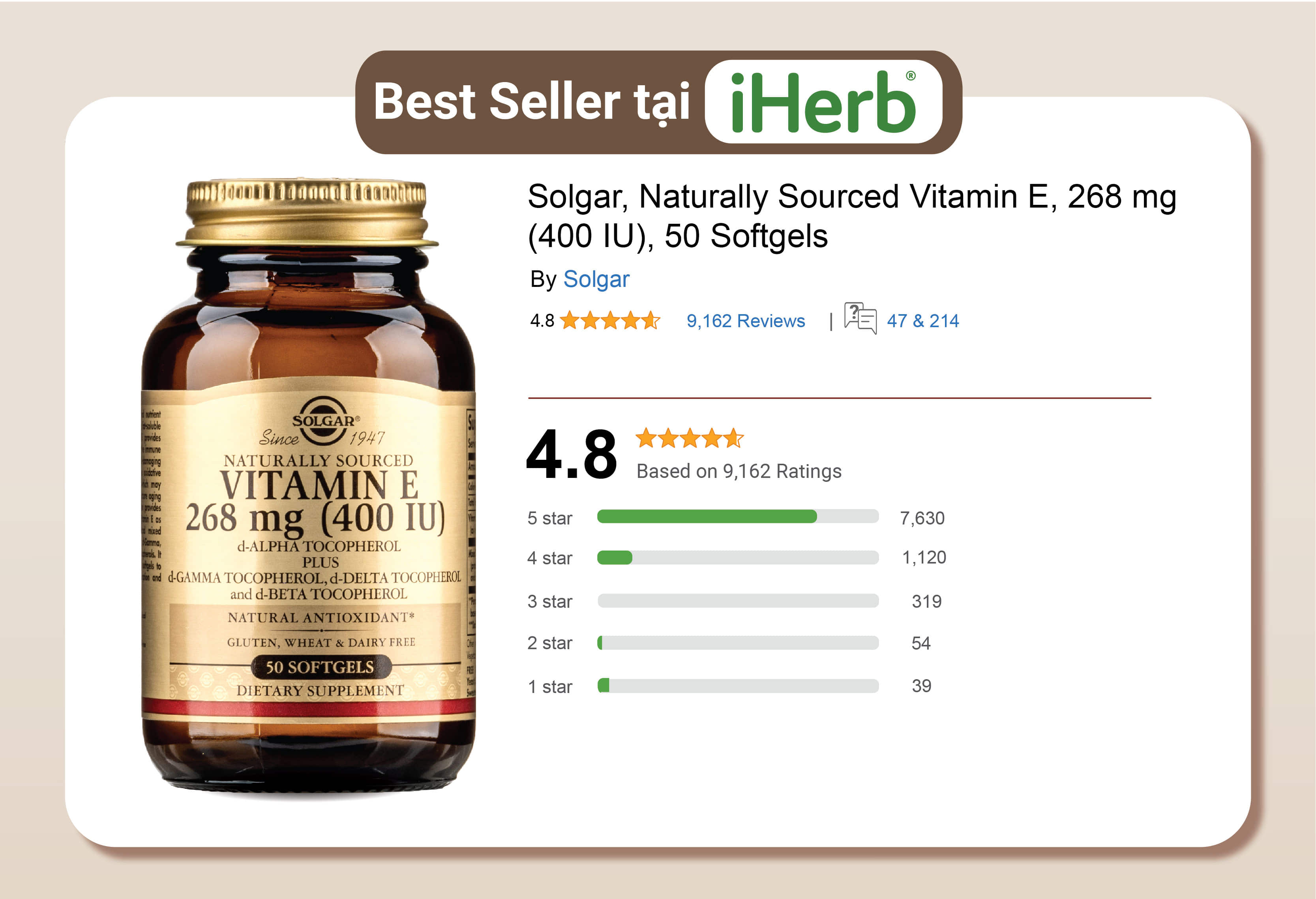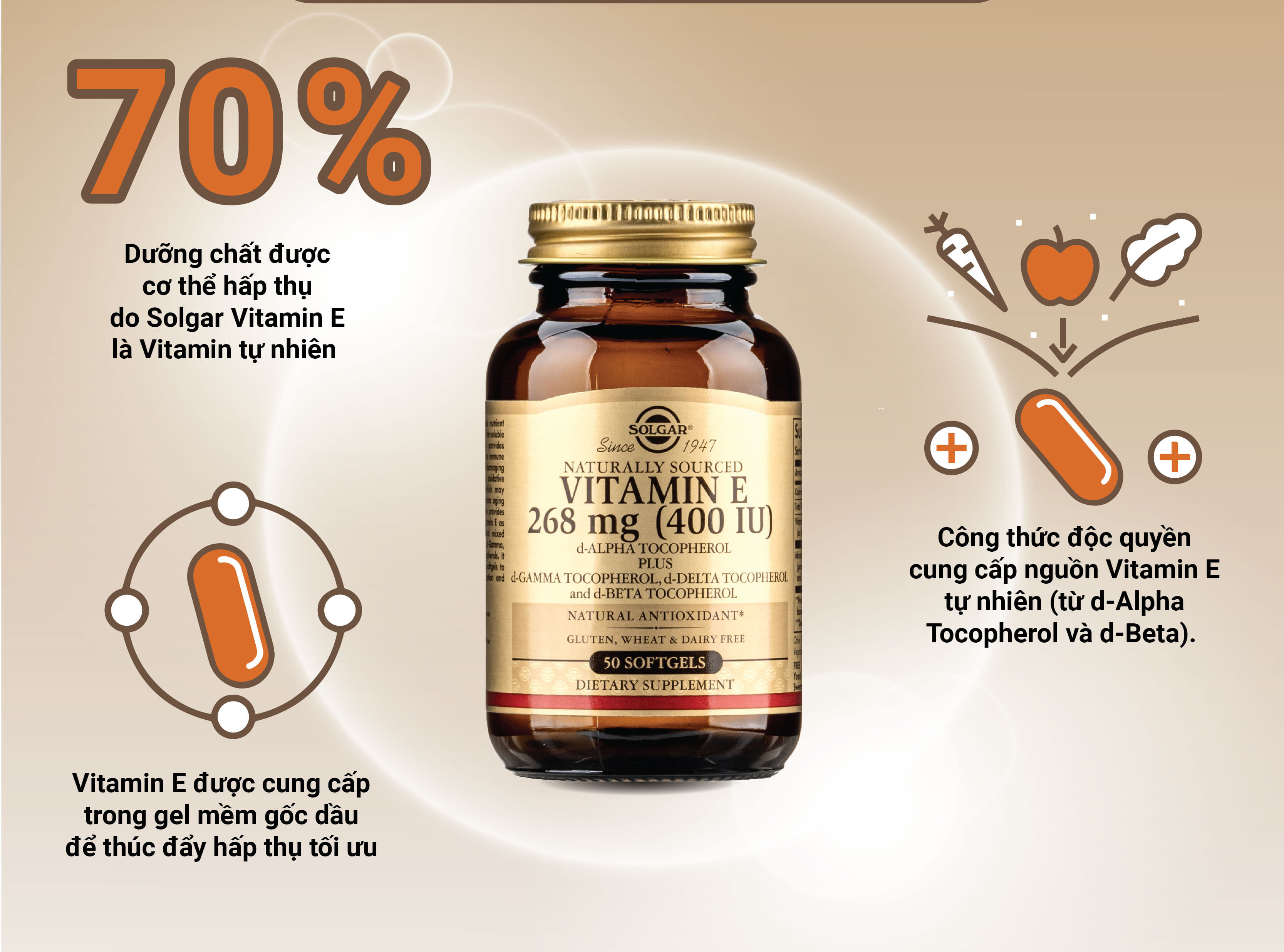 Solgar Vitamin E 400 IU cung cấp một nguồn vitamin E tự nhiên.